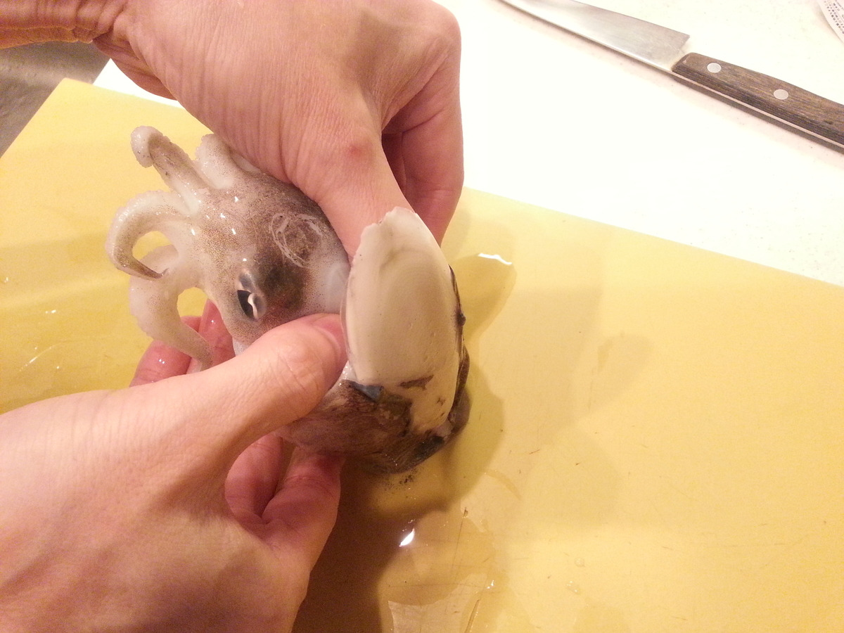 - 기본 손질 순서: 1) 몸통-다리 분리 - 다리 쪽 내장 파열 주의 2) 먹물주머니와 껍질 제거 - 껍질은 미끄러우므로 소금 약간으로 마찰력 확보 3) 부리 제거 4) 눈 주변 손질 5) 속막 제거 후 칼집