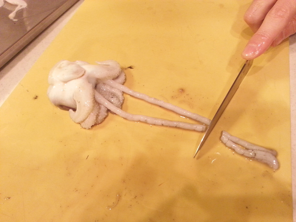 - 다리 처리: - 흡반을 정리하거나 반으로 갈라 길이 균일화 - 무침용이면 3-4cm 절단, 숙회는 5-6cm 견고하게