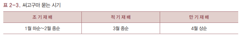 - 조기재배 시 3월 말 - 4월 초 (비닐, 터널 재배)