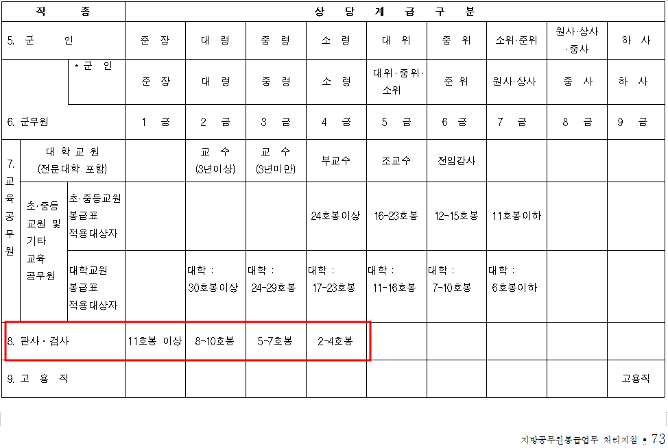 | 급수 | 일반직 | 교사 | 경찰 | 소방 | 군인 |