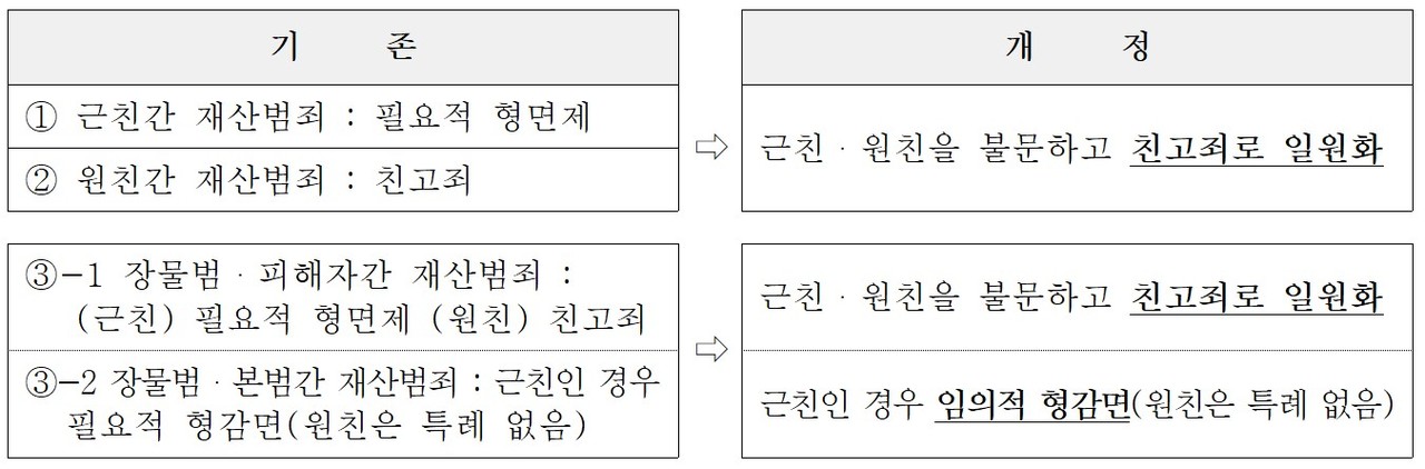 헌법재판소의 헌법불합치 결정 이후 국회는 친족상도례의 전면 폐지 및 제도 개편에 나섰고, 그 결과 형법 개정안이 통과되었습니다. 이번 개정의 핵심은 처벌 면제라는 절대적 보호를 제거하고, 피해자의 의사를 중심에 두는 구조로 전환했다는 점입니다. 개정의 주요 내용은 다음과 같이 정리할 수 있습니다.