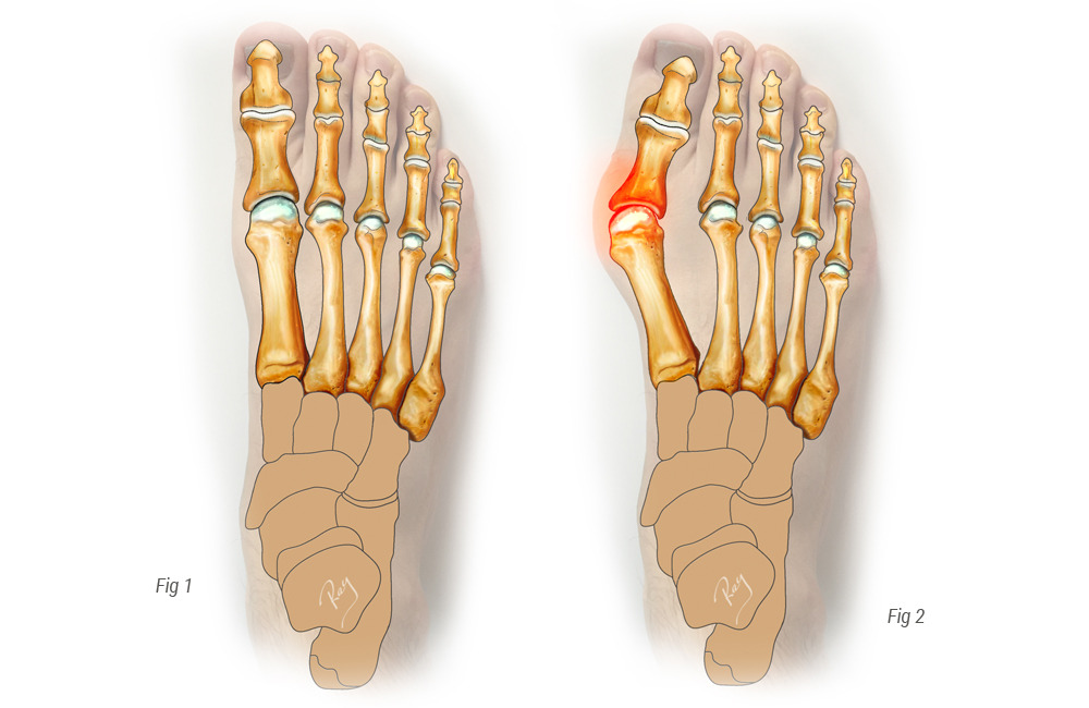 요산 결정이 관절에 쌓이면서 염증을 유발하는 질환입니다. 주로 엄지발가락 관절에 통증이 시작되지만, 발바닥 전체로 통증이 확산되기도 합니다. 심한 경우 붓기와 열감이 동반되어 신발 착용이 힘들 정도가 됩니다.
