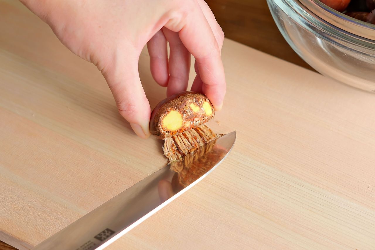 1. 생밤의 윗부분에 칼집을 내세요.