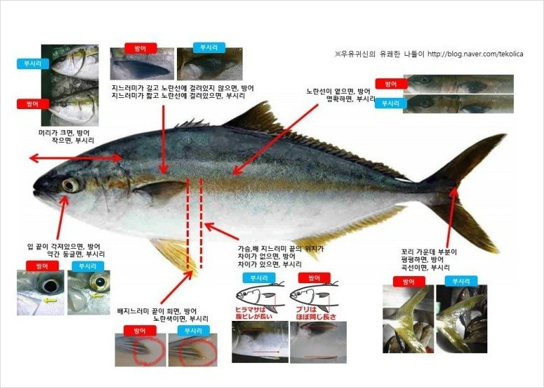 - 부시리는 등지느러미 가시가 6~7개이며, 7개면 거의 확실히 부시리로 봅니다.