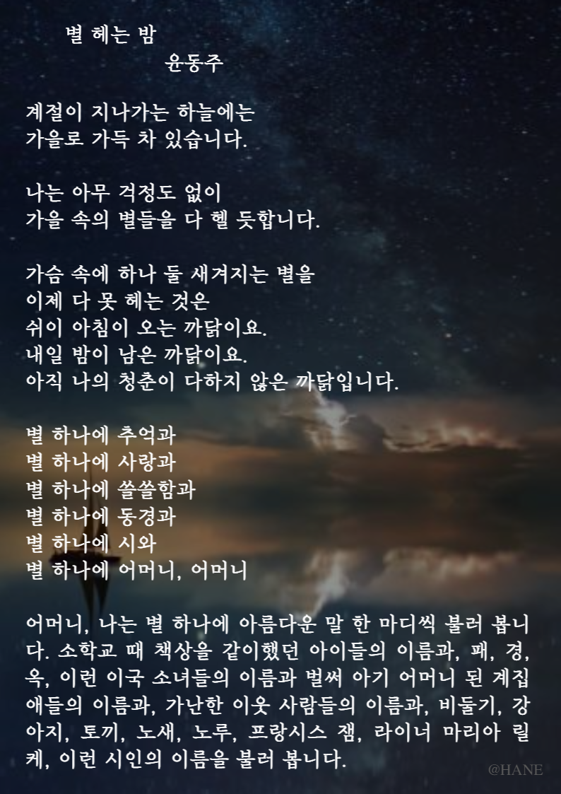 어머님, 나는 별 하나에 아름다운 말 한마디씩 불러봅니다. 소학교 때 책상을 같이 했던 아이들의 이름과 패, 경, 옥 이런 이국 소녀들의 이름과, 벌써 애기 어머니 된 계집애들의 이름과, 가난한 이웃 사람들의 이름과, 비둘기, 강아지, 토끼, 노새, 노루, 프랑시스 잠, 라이너 마리아 릴케, 이런 시인의 이름을 불러봅니다.​