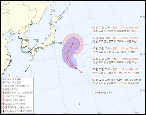 - 발달 과정: 7월 2일 오전 09:00 기준 도쿄 남남동쪽 약 1 510 km 해상으로 이동하며 해수면 온도 29 ℃ 이상, 풍속 15 m/s 내외로 점진적 강화