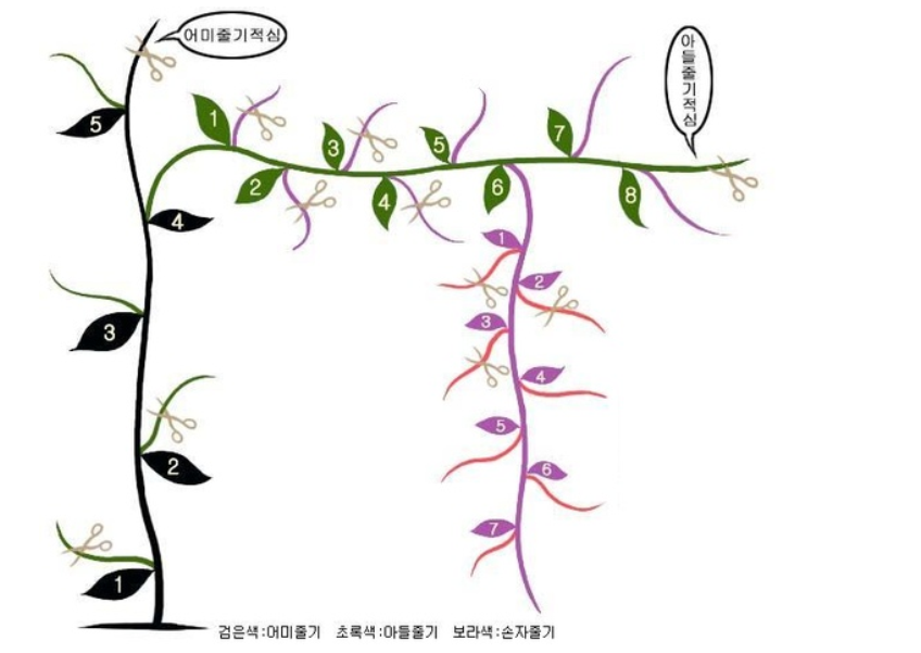 2. 아들줄기 아래에서 나오는 손자순 중 상위 2~3개만 키워주세요.
