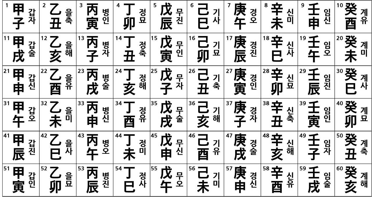 - 갑자, 을축, 병인, 정묘, 무진, 기사, 경오, 신미, 임신, 계유
