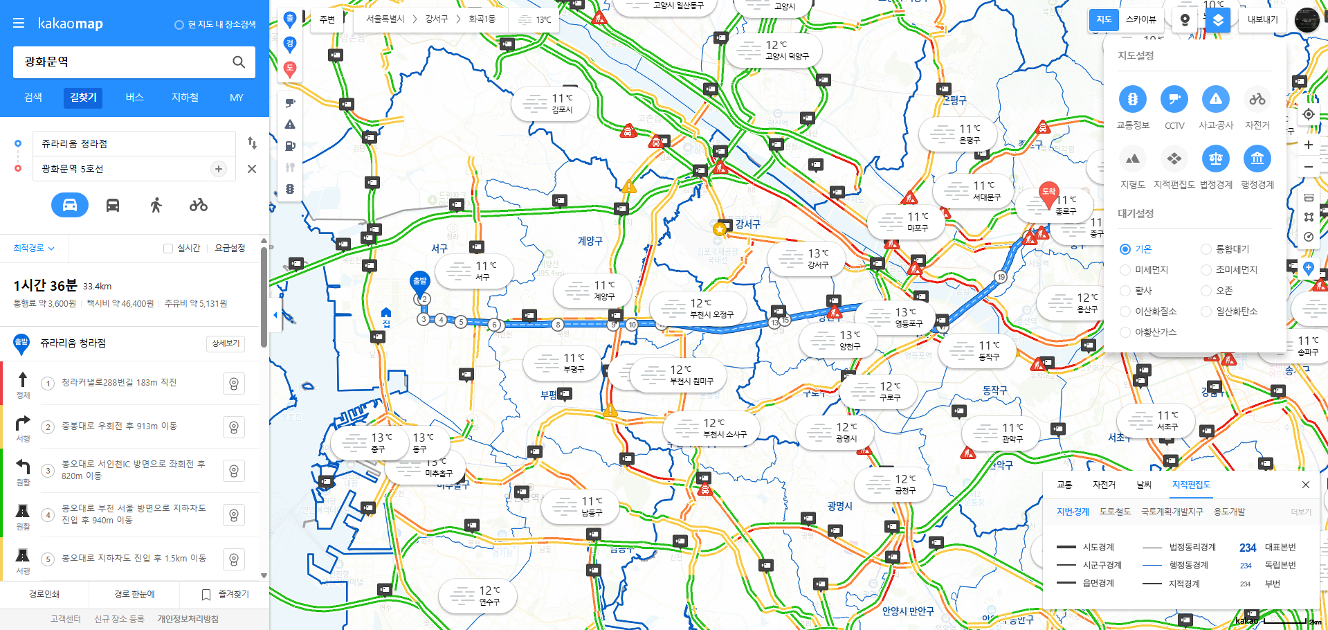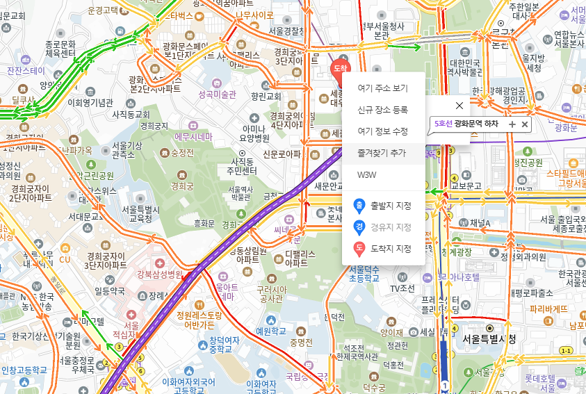 - 실시간 교통정보: 서울, 수도권뿐 아니라 전국 주요 도로의 교통체증 상황을 실시간으로 표시.